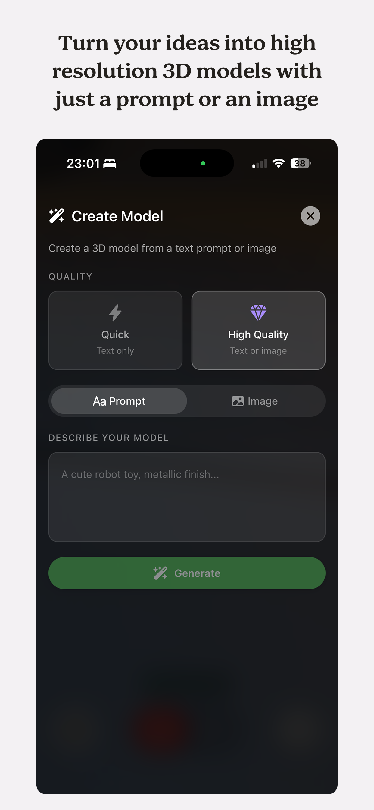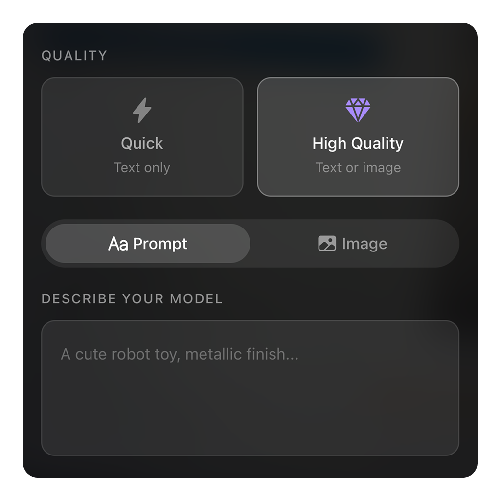 Turn words into worlds in seconds. Simply type a text prompt or upload a reference image, and watch our AI generate unique high-fidelity 3D models. No 3D design skills required, just pure imagination.