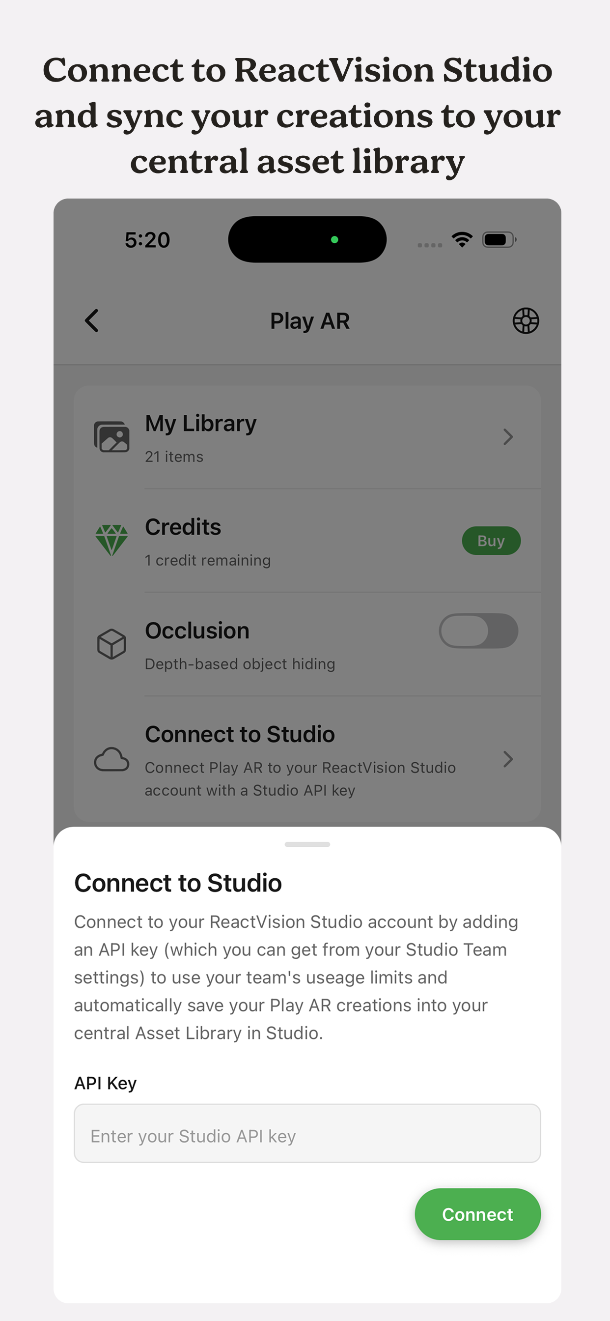 Unlock the full potential of Play AR by connecting Play AR to your ReactVision Studio account. This seamless integration automatically syncs every model you generate directly to your library, ensuring your on-the-fly concepts are safe. Plus, you’ll tap into your team’s existing usage limits, offering you the best value on creation costs, making it the ultimate tool to bridge the gap between rapid prototyping and professional production. With more integrations coming soon.