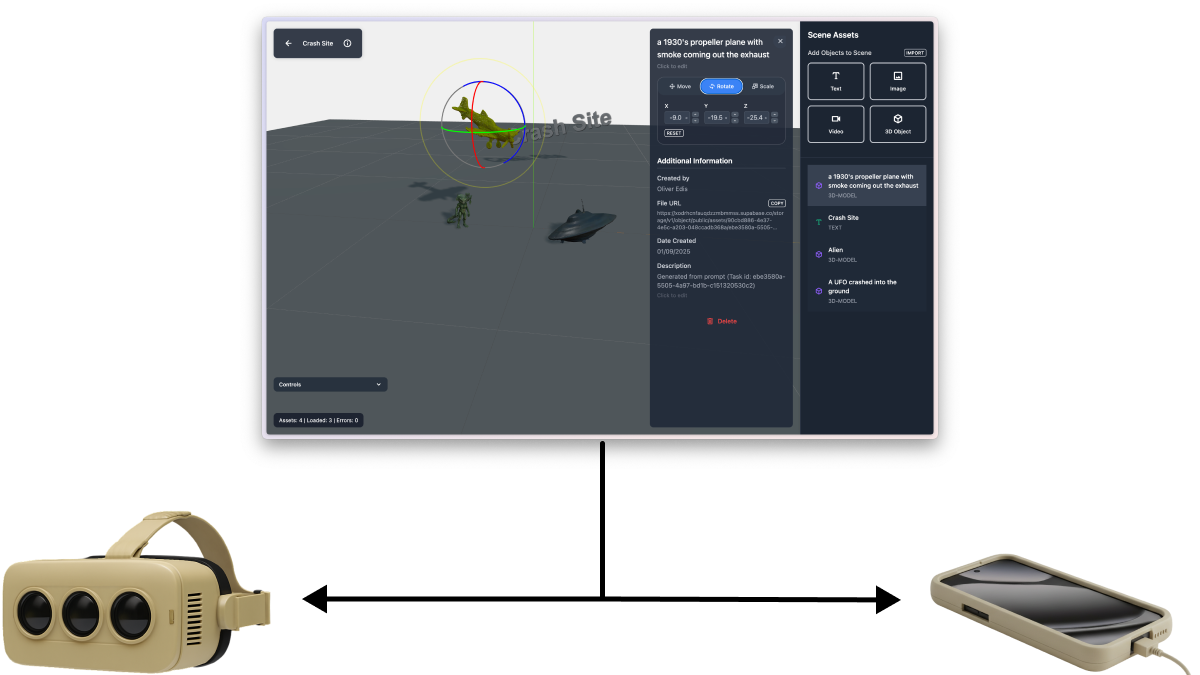 Build your spatial app visually, create projects and organise them into scenes right inside Studio. Use built-in AI to generate and refine 3D assets in seconds. Connect Studio to your app with ViroReact, which renders everything natively on each supported platform via our renderer. Studio’s backend stores, versions, and delivers your assets to your app, giving your team a single source of truth from prototype to production.