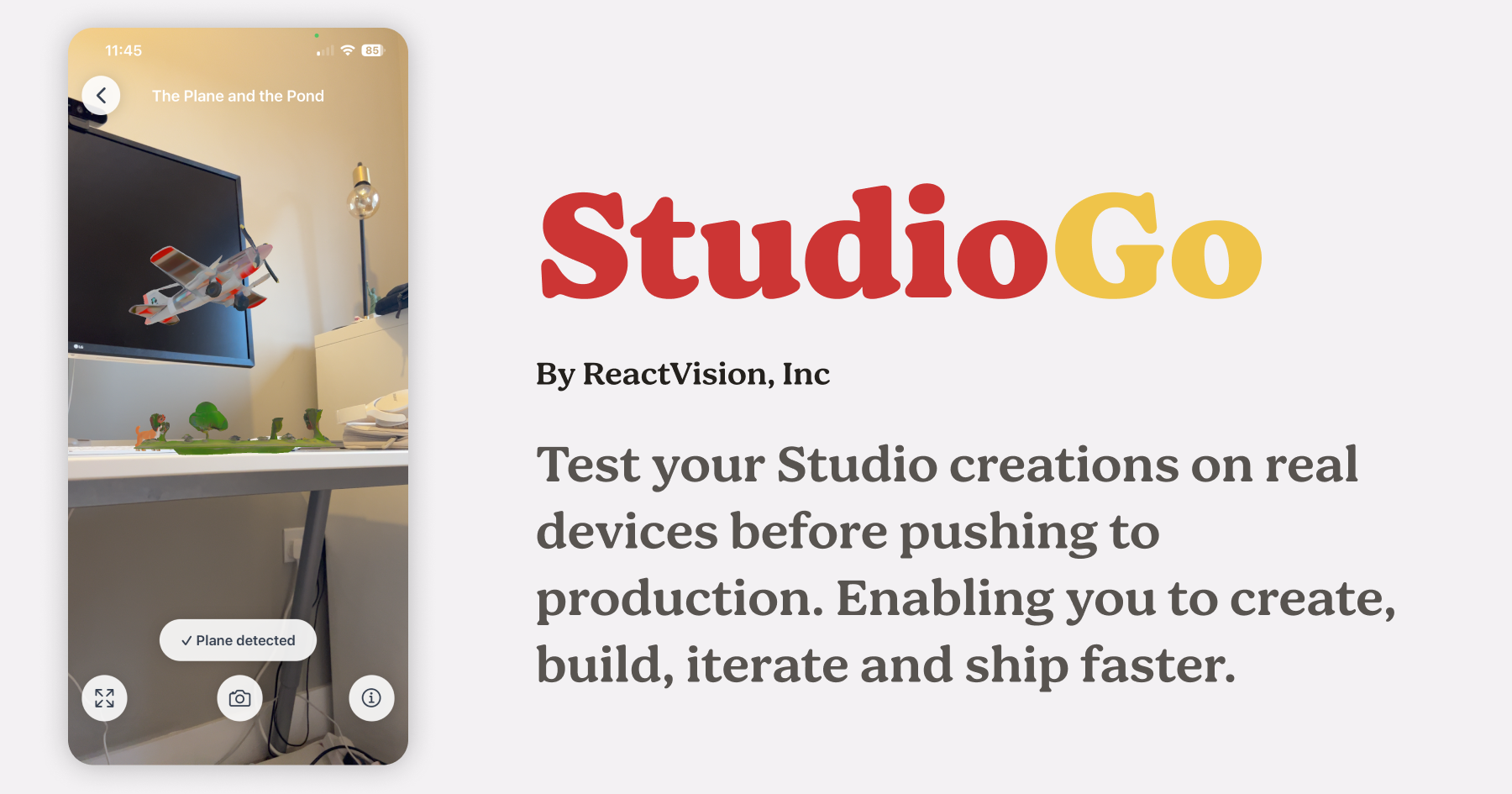 Studio Go is your on-device playground for XR. Launch scenes built in ReactVision Studio to any ViroReact-supported device and test on real hardware with the same native renderer you’ll ship to production with. Iterate in a safe, pre-production sandbox to validate tracking, performance, and interactions before release. Prototype in minutes, no code required, while keeping the full fidelity and speed of ViroReact’s native pipeline.